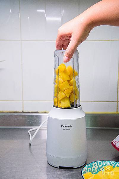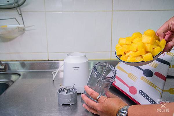 大概裝到八分滿左右,就可以裝上刀蓋。剩下的冷凍芒果留著備用