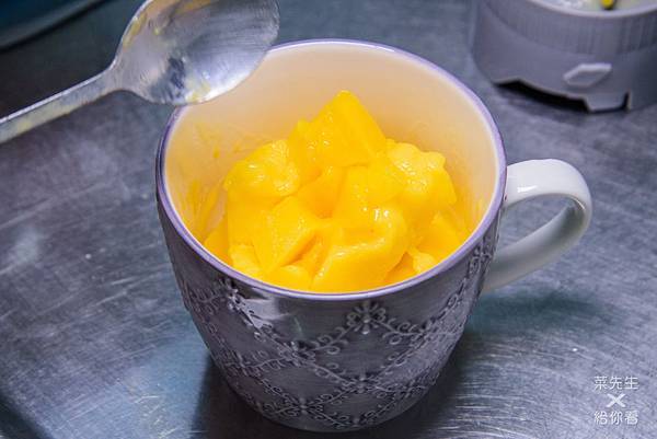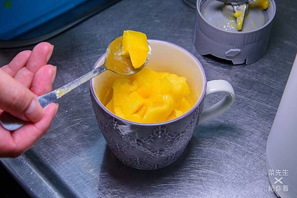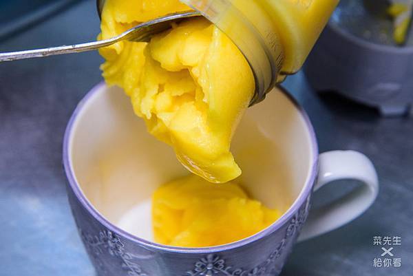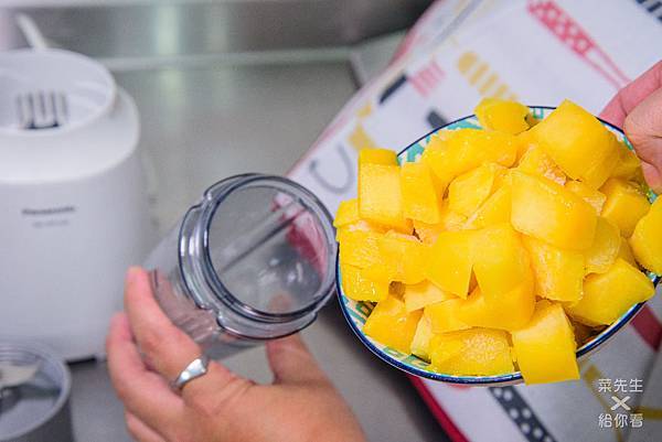 再把放在一旁稍微退冰的冷凍芒果也一起放進去。